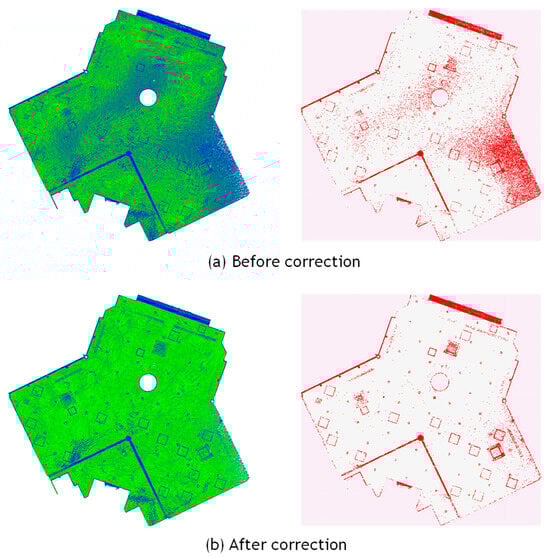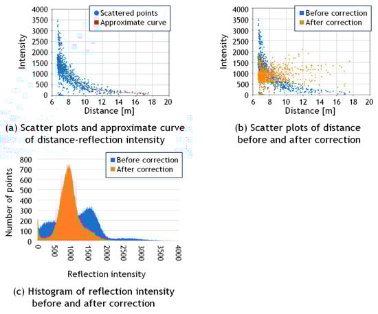 Figure 3b presents the sample points and Figure 3c shows the histogram of reflection intensity values before and after correction. It can be observed that the reflection intensity values, which originally decreased with increasing distance, are corrected to approximate a constant value regardless of distance. Furthermore, it indicates that the corrected values approximately follow a normal distribution. This trend is also visually confirmed in the point clouds shown in Figure 4a,b, which display the data before and after correction, respectively. The data was acquired by scanning the walls of an underground parking lot. Before correction, considerable color variations corresponding to fluctuations in reflection intensity were observed in the background wall regions; however, after correction, the color became nearly uniform, confirming that the correction brought the intensity values closer to a constant level. This is likely because the reflection intensities of points corresponding to large, uniform surfaces composed of the same material were properly normalized.