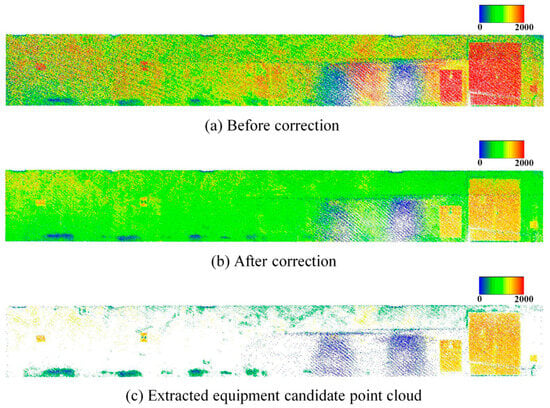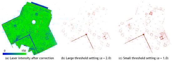 Figure 5 shows a comparison of the detection results of equipment candidate points under different threshold settings. Figure 5a presents an example of the reflection intensity correction result obtained by applying the procedure described in the previous section to the MLS point cloud of a building ceiling surface. As shown in Figure 5b, when the threshold parameter α is set to a large value, the number of points extracted as potential equipment candidates decreases, while false detections of non-equipment regions are also reduced. Conversely, as shown in Figure 5c, when α is set to a smaller value, equipment objects become easier to detect, but the number of false detections of non-equipment regions increases. This threshold is defined as a multiple of the standard deviation of the corrected intensity values and is independent of the manufacturer’s internal scaling of intensity data. Therefore, it can be applied consistently across different scanner models. However, since the correction performance varies slightly among scanning and the intensity range of actual equipment cannot be determined without examining the data, the appropriate α value was determined empirically by visually inspecting the detection results. In general, satisfactory performance was obtained with α = 1.0 or α = 2.0, indicating that precise parameter tuning was not required.