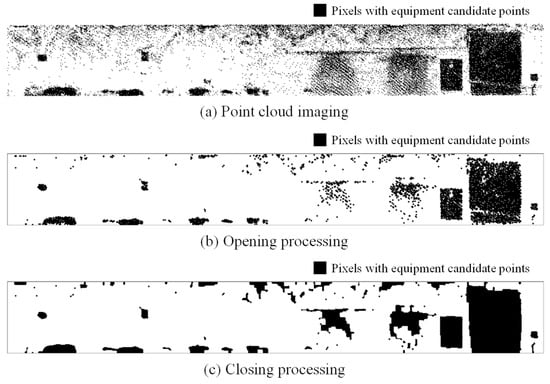 From the image obtained through the process described in the previous section, it can be observed that some pixels unrelated to actual equipment have been incorrectly extracted, and that certain regions corresponding to a single piece of equipment have been fragmented. To address these issues, morphological processing is applied to the binary image. Morphological operations consist of dilation, which expands binary regions by one pixel, and erosion, which contracts them. In the opening operation, erosion is performed n times, followed by n iterations of dilation. This process is effective for removing isolated pixels. However, if the number of iterations is too large, it may result in the fragmentation of a single equipment object into multiple parts or the removal of small equipment elements. Conversely, the closing operation performs n iterations of dilation followed by n iterations of erosion. This operation helps close small holes and connect disjointed components in the binary image. However, excessive iterations may cause adjacent equipment objects to merge into a single region. Therefore, the number of iterations n was empirically determined based on the shape and size of the equipment to be extracted. In this study, the number of iterations n was set between 1 and 4, depending on the dataset. Figure 6b,c show the results after applying the opening and closing operations, respectively. It can be observed that the opening operation removes isolated pixels, while the closing operation reconnects fragmented components. Finally, connected-component labeling is applied to assign unique labels to each connected region in the binary image, enabling the extraction of individual equipment objects. These labels are also assigned to the corresponding point cloud to preserve the link between image and 3D data.