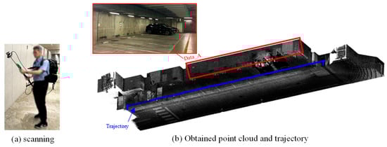 The OS0 provides a horizontal field of view of 360° and a vertical field of view of 90°, making it susceptible to blind spots in the vertical direction. Therefore, as shown in Figure 7a, the scanner was mounted on a monopod and tilted at an angle so that the laser beams would strike the ceiling surface perpendicularly. The underground parking lot was scanned while walking at a normal pace. As shown in Figure 7b, the wall surface point cloud used in the experiment (referred to as Data_A) was acquired by walking in a straight line parallel to the target wall, maintaining a distance of approximately 6 m. The scanning duration was approximately 3 min. The raw dataset contained about 1 million points, which was reduced to approximately 0.5 million points through the sampling process. The smallest piece of building equipment identified in this dataset was a rectangular fire extinguisher sign measuring approximately 25 cm × 20 cm.