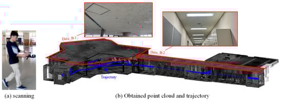On the other hand, the VLP-16 provides a horizontal field of view of 360° and a vertical field of view of 30° and is likewise prone to blind spots in the vertical direction. To address this limitation, a Hovermap SLAM (Simultaneous Localization and Mapping) Unit by Emesent, equipped with the VLP-16, was held parallel to the floor, and the interior of a university building was scanned while walking at a normal pace, as shown in Figure 8a. By rotating the VLP-16 mounted at the tip of the Hovermap, uniform laser irradiation over a 360° × 360° area can be achieved. Figure 8b presents the point clouds used in the experiment: the ceiling surface of the elevator hall (Data_B-1) and that of the corridor (Data_B-2). The total scanning time was approximately 5 min. Data_B-1 originally contained approximately 4 million points, which were down sampled to 1.3 million, while Data_B-2 contained approximately 2 million points, reduced to 0.6 million after sampling. The smallest piece of building equipment identified in this dataset was a circular sprinkler with a diameter of approximately 10 cm.