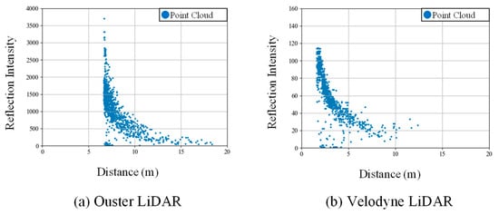 Figure 9 presents a comparison of the reflection intensity distributions from point clouds acquired using the OS0 and VLP-16 scanners. A study by Viswanath et al. [36] reported significant differences in the reflection intensity values obtained from these two types of scanners. Specifically, the reflection intensity values from Ouster LiDAR represent raw, uncalibrated data, whereas those from Velodyne LiDAR are pre-calibrated for distance and laser power, as documented in the manufacturer’s manual. The two scanners produce different intensity outputs due to the application of internal scaling. In this study, the scaled intensity values provided by each manufacturer were directly used in the experiments. As shown in Figure 9a, the data acquired with the OS0 exhibited a reflection intensity trend consistent with that reported in the literature. In contrast, the VLP-16 data, shown in Figure 9b, exhibited a decrease in reflection intensity with increasing distance. To address this discrepancy, reflection intensity correction was applied to both datasets using the method proposed by Wan et al. [34], as described in Section 3.3.