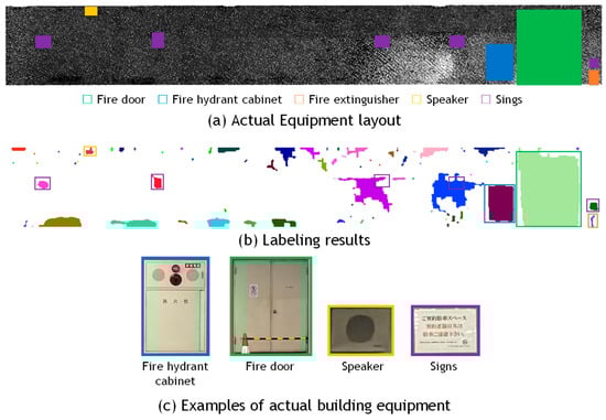 Figure 10, Figure 11 and Figure 12 present the results of building equipment detection. The detected equipment layout was visually compared with ground-truth images of the actual site. A piece of equipment was considered correctly detected if one or more labeled pixels were found at the corresponding location. Table 4 summarizes the detection results for each dataset. The threshold parameter was set to α = 1.0 for Data_A in Figure 10, and α = 2.0 for Data_B-1 in Figure 11, and Data_B-2 in Figure 12. The ground-truth data were manually created through direct visual inspection of the actual site and careful examination of multiple photographs taken at the location.
