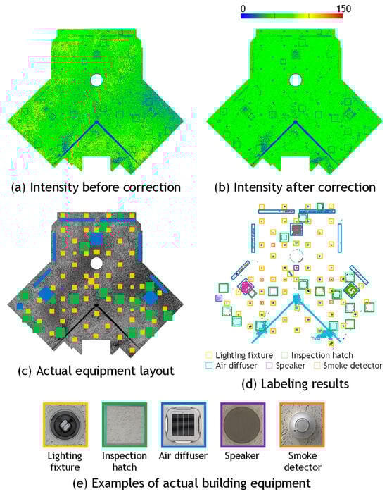 To verify the general applicability of the proposed method, an additional experiment was conducted using a FARO Orbis laser scanner, which differs from the devices used in the previous experiments. Similarly to the Hovermap system, this scanner is a handheld unit equipped with a rotating mechanism that enables 360° × 360° omnidirectional scanning while walking. The maximum scanning range is 120 m, the scanning rate is 640,000 points per second, and the scanning accuracy is 5 mm. The experimental site was the ceiling of a university campus building, as shown in Figure 14a, which is different from the one used in Figure 8. As illustrated in Figure 14b, the ceiling contains a total of 20 pieces of equipment, including lighting fixtures, sprinklers, air diffusers, speakers, security cameras, and Wi-Fi routers. This dataset is referred to as Data_C (MLS). Figure 15a shows a scatter plot of reflection intensity before and after correction, and Figure 15b presents the corresponding histogram. Since the scanned area was relatively small and the maximum scanning distance was approximately 6 m, the decrease in reflection intensity with increasing distance was not clearly observed, and the correction effect could not be distinctly confirmed. However, the histogram in Figure 15b indicates that the corrected reflection intensities approximately followed a normal distribution. From the color representation of the reflection intensity shown in Figure 15c, no clear difference can be observed before and after the correction; however, the intensity values appear to be distributed approximately uniformly. The proposed detection method was then applied to this point cloud, with the threshold parameter set to α = 2.0. As a result, 16 pieces of equipment were successfully extracted, each forming a single cluster as shown in Figure 15d,e. In some cases, two lighting fixtures were split into two clusters. Three air diffusers and one sprinkler were not detected, most likely because both their color and material were similar to the ceiling background, resulting in no significant difference in reflection intensity. Although the effect of reflection-intensity correction could not be clearly confirmed for this dataset, satisfactory extraction results were obtained, demonstrating the general applicability of the proposed method.