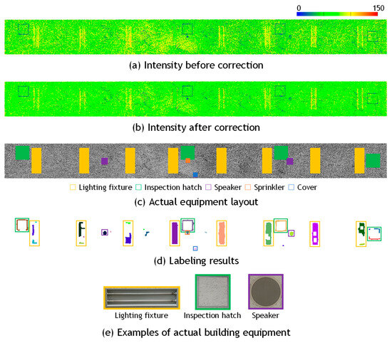 Future work will focus on addressing over-detection of equipment regions, as well as handling cases where a single piece of equipment is fragmented into multiple components. We plan to introduce post-processing procedures for region merging and splitting. Specifically, incorporating 3D shape connectivity, planar distance-based region integration on the projected surface, or least-squares fitting of geometric primitives such as rectangles and circles is expected to mitigate over-segmentation and under-segmentation. Furthermore, detection performance will be assessed for each equipment category (e.g., lights, sprinklers, speakers, and signs) to identify which classes benefit most from the use of intensity information. Moreover, the use of recently developed hyperspectral LiDAR systems may enable more accurate detection and classification of building equipment by considering the wavelength-dependent characteristics of reflectance [32]. In addition, we plan to compare the proposed correction method with other existing approaches and explore its applicability to buildings with non-flat or more complex geometries. We also focus on integrating corrected intensity data with orthophoto color information to further reduce false detections caused by stains and illumination variations. Although this study focused on equipment detection from pre-acquired LiDAR data, future work may also consider data compression and communication issues that are essential for practical and large-scale applications [40,41].