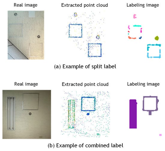 For Data_B-1 and Data_B-2, the over-detection rates were relatively low, at 27.9% and 17.9%, respectively. Since these indoor datasets closely adhered to the assumption of surface uniformity, favorable results were obtained. However, the number of detected regions was significantly larger than the actual number of equipment items, resulting in high correct detection rates of 197.7% and 175.0%, respectively. This discrepancy is attributed more to the image processing stage of the proposed method than to the reflection intensity correction. Even after applying morphological processing, the extracted pixels were not always sufficiently connected, causing a single piece of equipment to be segmented into multiple labeled regions. This issue was particularly evident in the case of ceiling inspection hatches, which consist of long and narrow metal frames, as shown in Figure 13a. Conversely, in cases where multiple pieces of equipment were located in close proximity, they were sometimes grouped and labeled as a single unit, as illustrated in Figure 13b. Another example is shown in Figure 11, where the method failed to correctly separate the metal support pillars of fire shutters and instead detected a broad region including adjacent equipment as a single entity. These results suggest the need to refine the criteria for connecting pixels identified as equipment candidates, to improve detection accuracy.