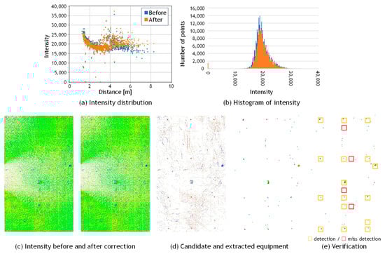 Here we present the experimental results using point cloud data acquired by a terrestrial laser scanner (TLS) to compare and validate the results obtained from mobile laser scanning (MLS). The test site was a ceiling surface on a university campus which is the same as in Figure 14a. The TLS experiment is referred to as Data_C (TLS), and the results are shown in Figure 16 and Table 4. The point cloud was acquired using a FARO Focus3D scanner, as shown in Figure 14c, with data captured from a single scanning position. The point cloud was down sampled at approximately 1 cm intervals. Figure 16a shows a scatter plot of reflection intensity before and after correction, and Figure 16b presents the corresponding histogram. Since the scanner was positioned vertically and scanned a flat ceiling surface, the incident angle was constant when the distance was constant. Figure 16c visualizes the reflection intensity using color coding. It is clearly observed that the reflection intensity is highest directly beneath the scanner and gradually decreases in a concentric pattern outward from the center. Although this is an empirical observation, these results suggest that the correction effect for TLS is greater than that for MLS, with the corrected reflection intensity approaching a nearly constant value. Furthermore, as shown in Figure 16d, all equipment items were detected as distinct clusters, without being divided into multiple regions or merged with adjacent equipment. The threshold parameter set to α = 2.0. However, the ceiling surface was composed of multiple panels, and the point clouds corresponding to the gaps between these panels were mistakenly detected as equipment, resulting in a relatively high over-detection rate. This example also corresponds to a case where background uniformity is not satisfied, similar to the wall example discussed in Section 4.3, and false detections have likewise occurred in this region. Despite the difference in scanners, the overall detection behavior was consistent with the MLS results. These findings confirm that the proposed method is applicable not only to MLS data but also to TLS data.