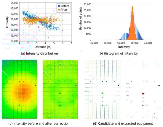 Comparison of laser intensity and equipment candidate extraction before and after correction.