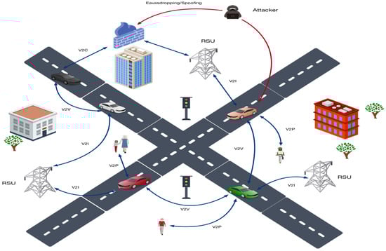 As illustrated in Figure 1, the V2X network is inherently open and dynamic, enabling adversaries to exploit multiple communication links. Typical threats include identity forgery and false data injection in V2V communication, eavesdropping and protocol downgrade attacks in V2I interactions, spoofing of pedestrian devices in V2P scenarios, and data theft or tampering in V2C uplinks. Such attacks compromise the system’s trust foundation and pose severe risks to traffic safety [1]. Therefore, ensuring the confidentiality, integrity, and authenticity of all V2X communication links is a fundamental goal in protocol design.