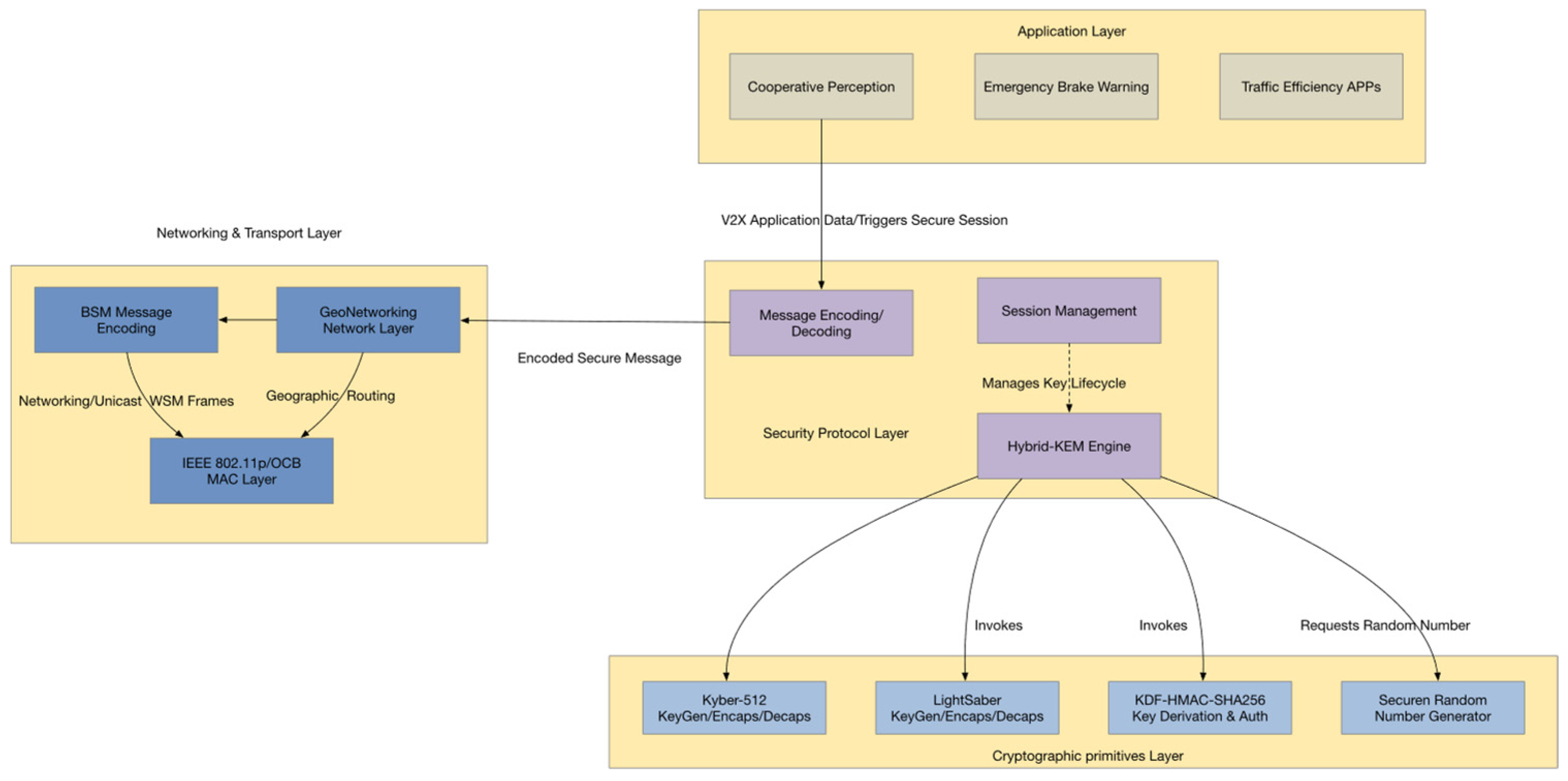 Despite these advances, notable gaps remain. Most existing studies rely on a single algorithm or conduct isolated performance benchmarks, lacking a holistic, protocol-level architecture that leverages the complementary advantages of multiple PQC schemes to cope with the dynamic, heterogeneous nature of V2X environments. Key challenges include the absence of hybrid designs that combine Kyber’s strong security with Saber’s efficiency [31], insufficient adaptability to V2X-specific conditions such as frequent link disruptions and high concurrency [32], and a lack of comprehensive comparative evaluations between PQC-based and classical RSA/ECDH protocols under realistic vehicular scenarios [33].