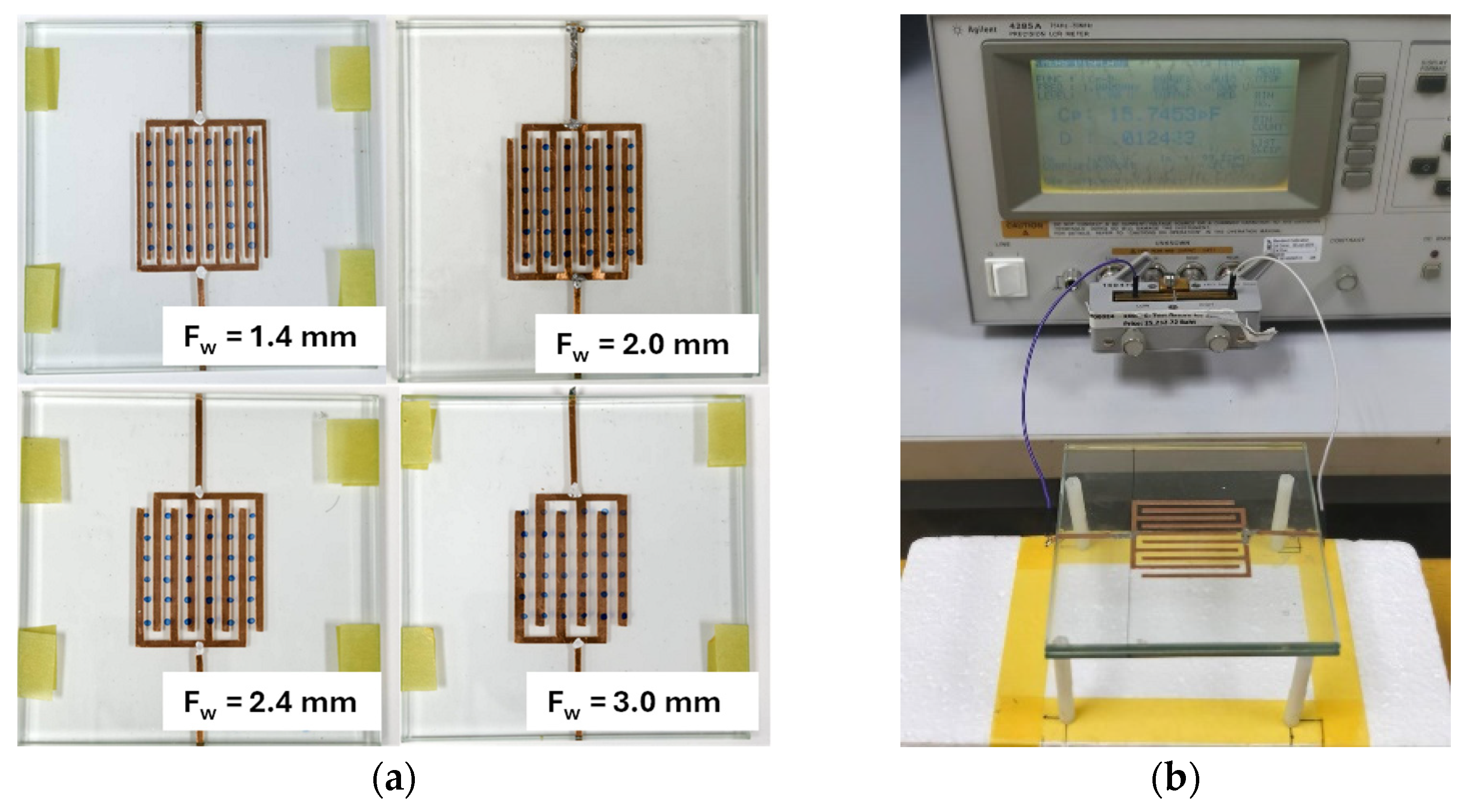 Experimental investigation was conducted to validate the analytical model developed for predicting the no-touch capacitance of the proposed IDCS structure. The fabricated electrodes were designed by varying their geometrical parameters to evaluate the influence of electrode dimensions on the total capacitance. For the measurement setup, IDCS electrodes with different