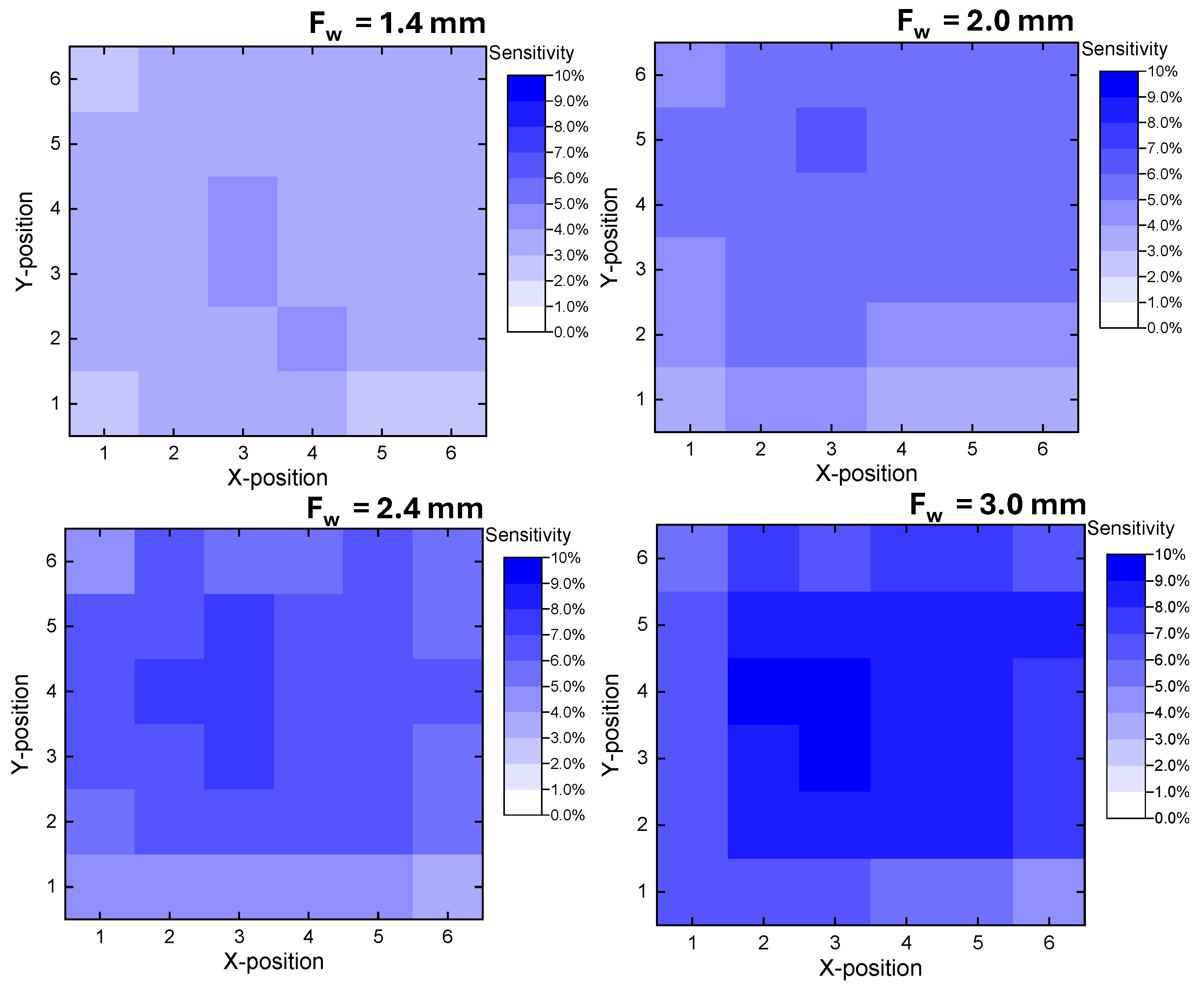 Fw of 1.4, 2.0, 2.4, and 3.0 mm to simulate the electric field coupling effect of a fingertip in contact with the glass surface. Cylinders with diameters of 10, 20, 30, and 40 mm were used to represent various fingertip sizes.