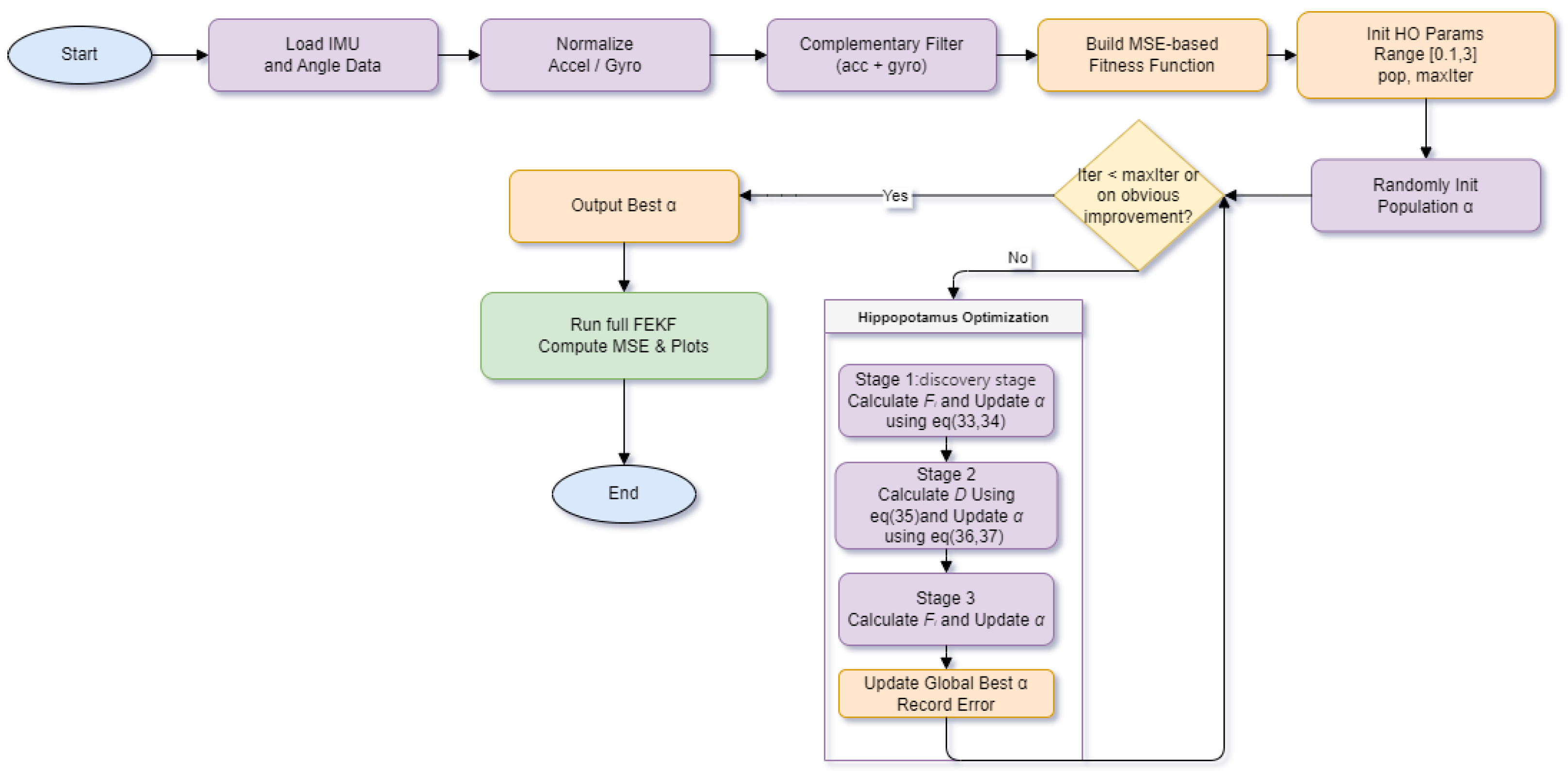 in the improved FEKF. HO, introduced in 2024, is a novel swarm intelligence optimization algorithm known for its excellent global search capability and convergence performance, achieving leading results on numerous benchmark test functions. In this study, HO is integrated into the FEKF-based attitude estimation framework to formulate an optimization problem where the attitude estimation error serves as the fitness function, enabling automatic identification of the optimal fractional order