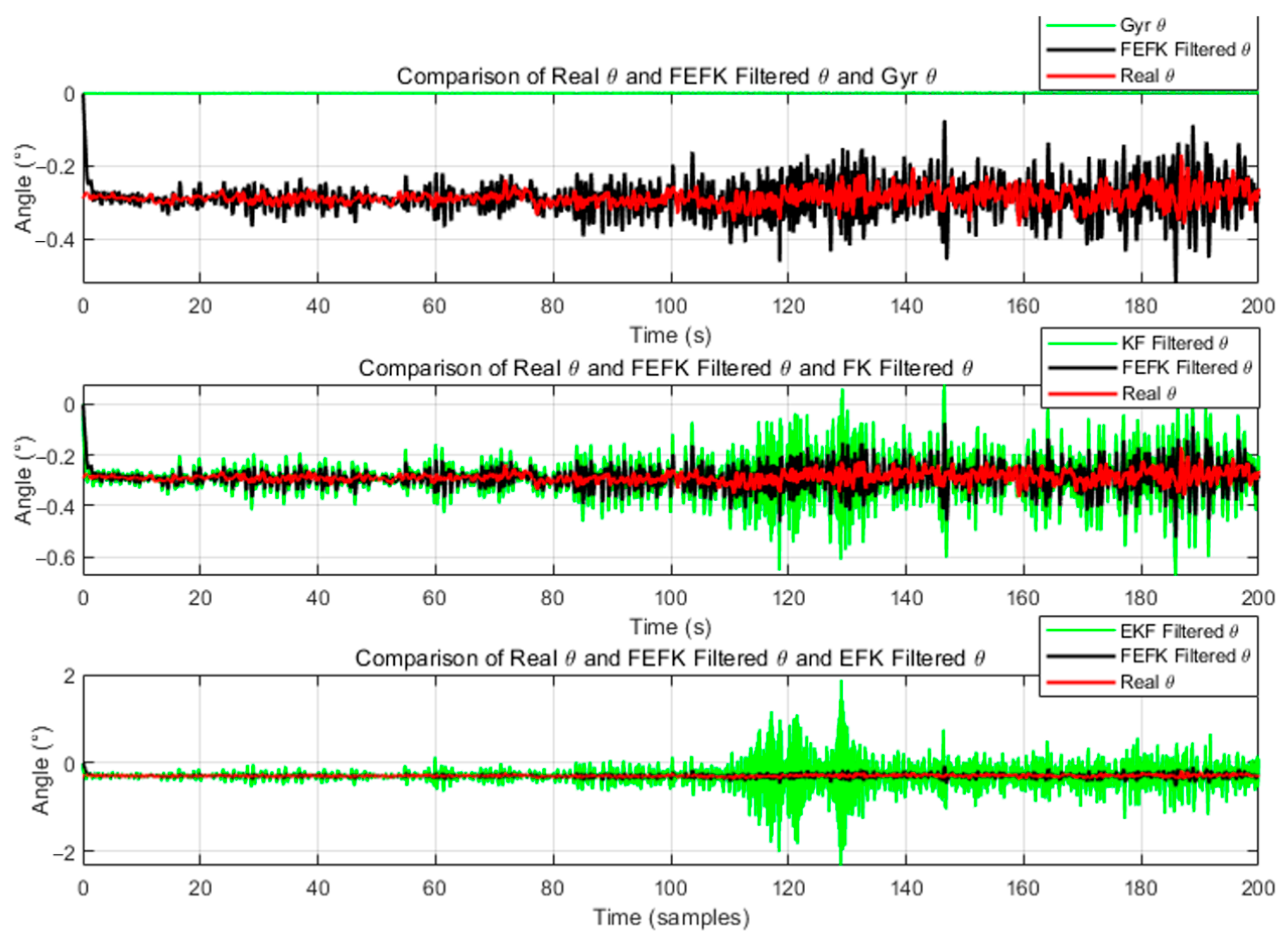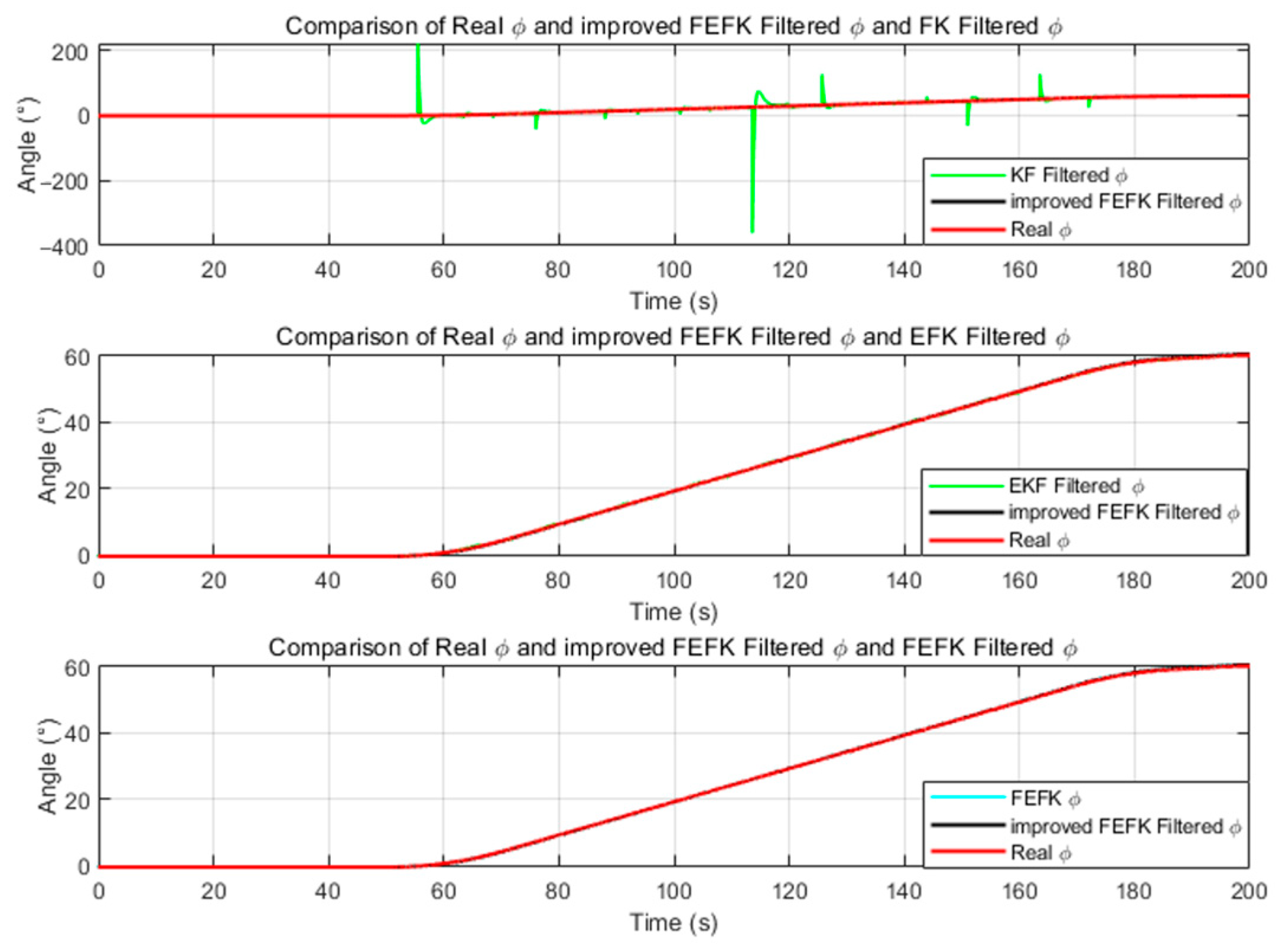 Figure 5, the improved FEKF proposed in this study clearly outperforms the gyroscope-based method, KF, and EKF in estimating the attitude angles.