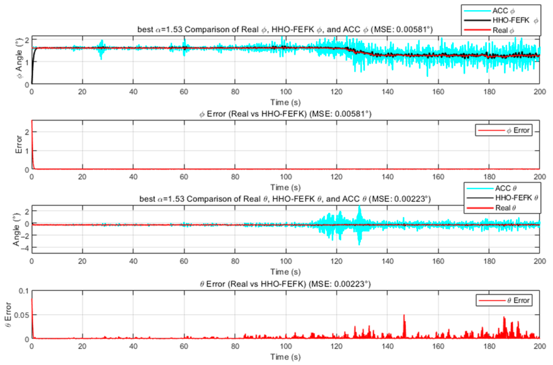 Unified Multi-Parameter Co-optimization: The current work focused on the critical parameter . A significant and logical next step is to expand the HO framework to perform a simultaneous, co-optimization of the complete parameter set , where Q and R are the process and measurement noise covariance matrices. This would holistically address the strong coupling effects between these parameters and could unlock further performance enhancements. Extension to Broader Application Domains: The demonstrated success of the HO-FEKF in attitude estimation strongly suggests its potential applicability to other complex state estimation problems where fractional-order dynamics are likely present. Future research could explore its utility in diverse fields such as robotics, biomedical signal processing, and financial time-series forecasting.