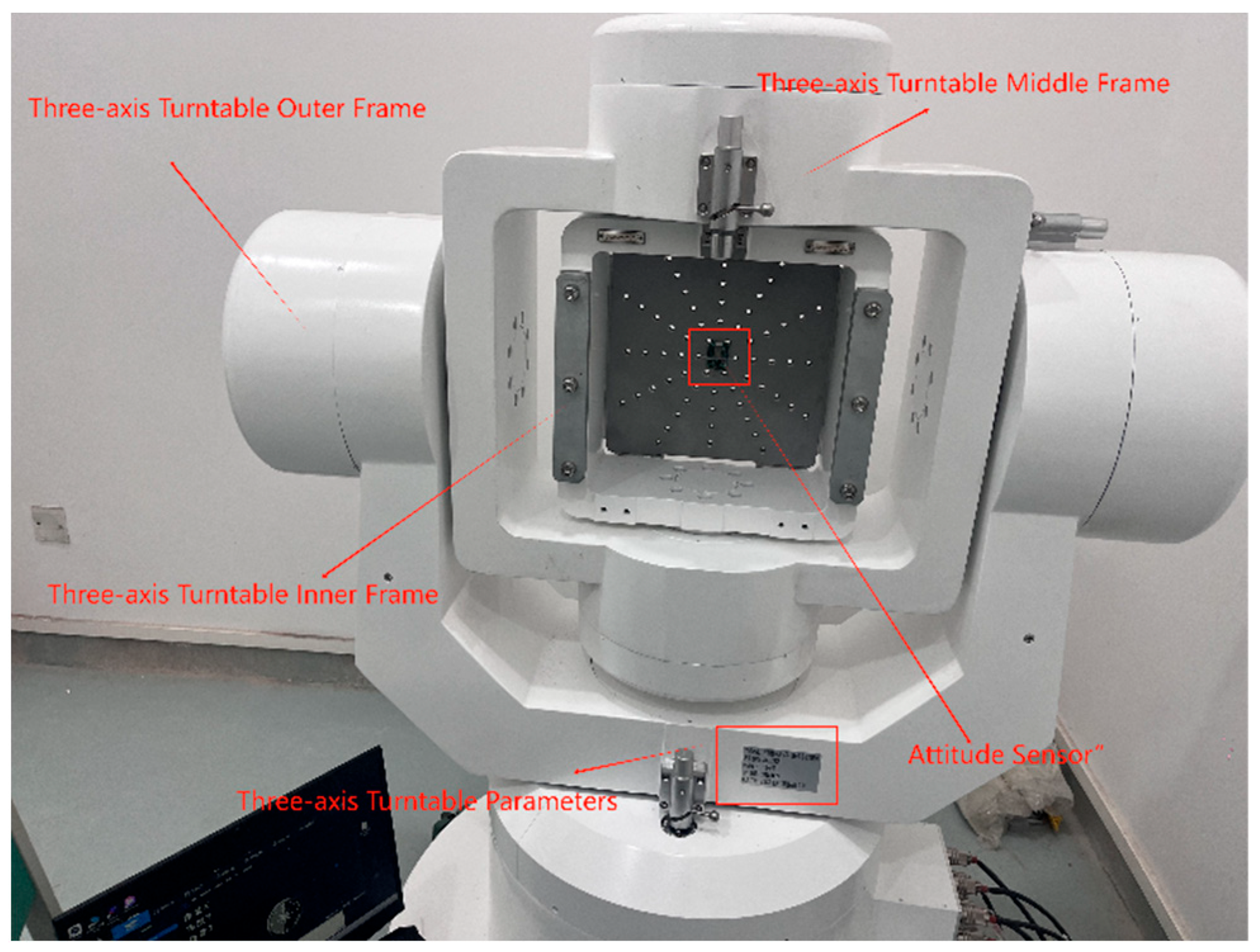 To further validate the feasibility of the proposed method, this study employed a three-axis inertial navigation test combined with a flight attitude simulation turntable to conduct algorithm verification. The data measured from the three-axis inertial navigation system and the flight attitude simulation turntable were used as the ground truth for attitude angles, serving as a benchmark for comparative experiments. The testing setup is illustrated in