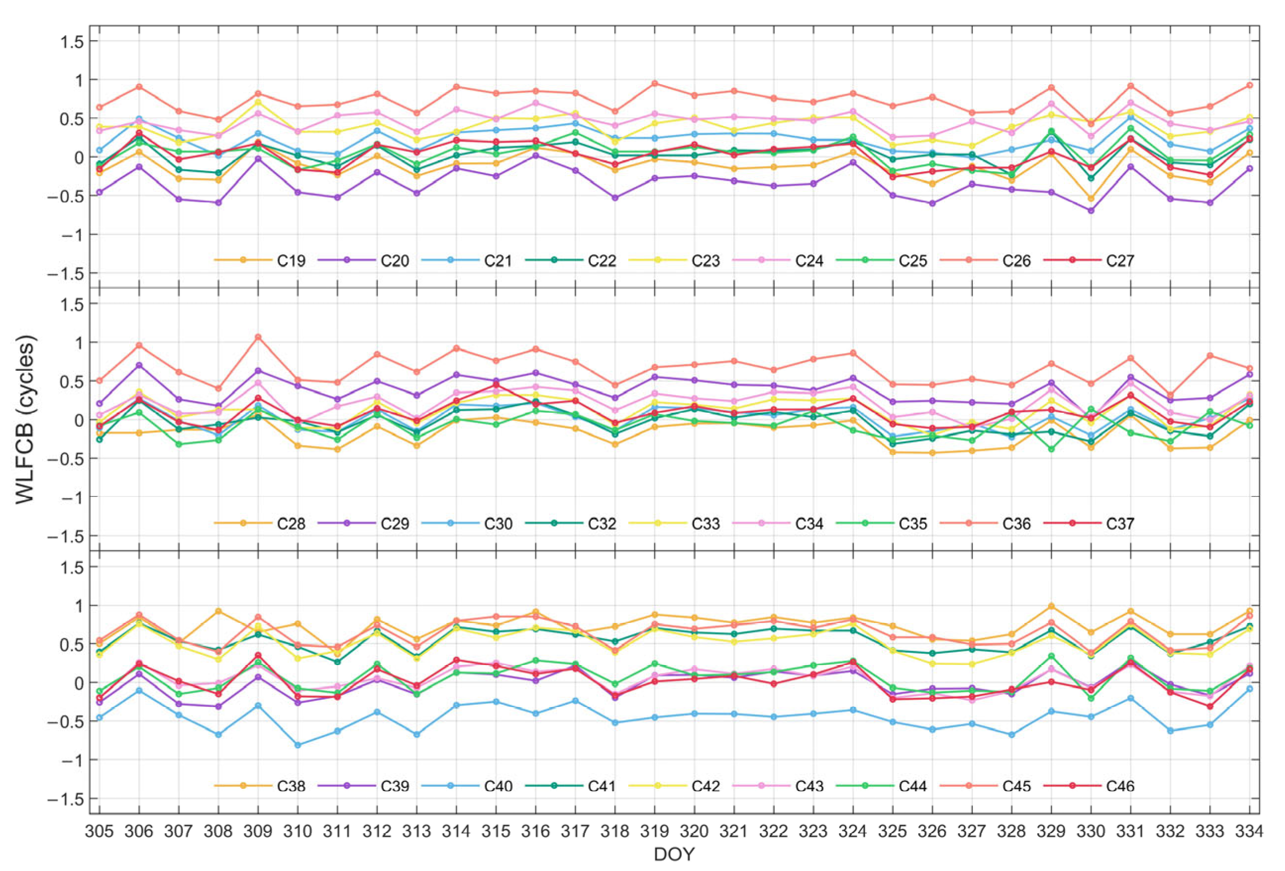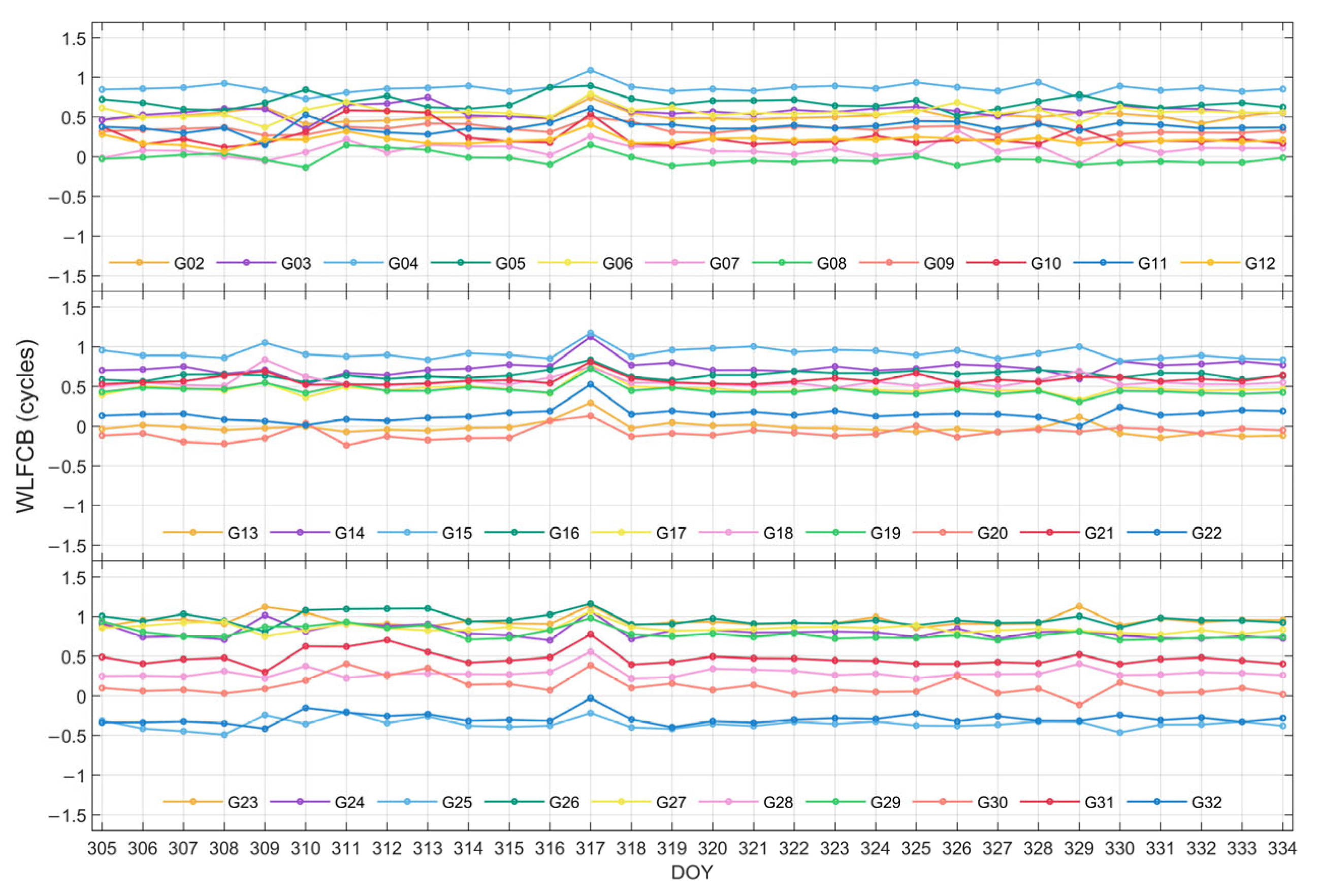 Figure 3, respectively. It can be observed that the WL FCB of both systems demonstrates favorable stability over the 30-day period. Among them, a jump is observed for GPS satellites on DOY 317, while for BDS-3 satellites on DOY 309 and DOY 331. Nonetheless, the WL FCB values generally stabilize before and after these jumps and remain largely stable throughout the rest of the period.