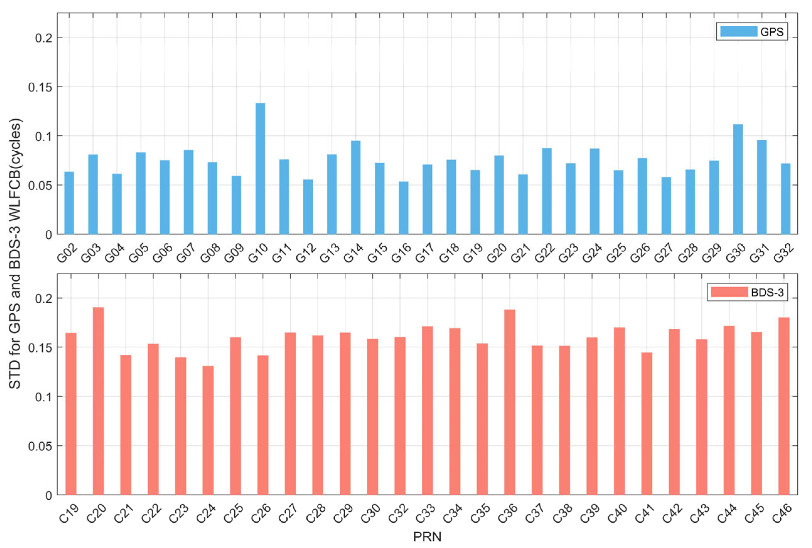 To further analyze the quality of the WL FCB products, the STD of the WL FCB for each satellite in both systems are statistically evaluated, as illustrated in