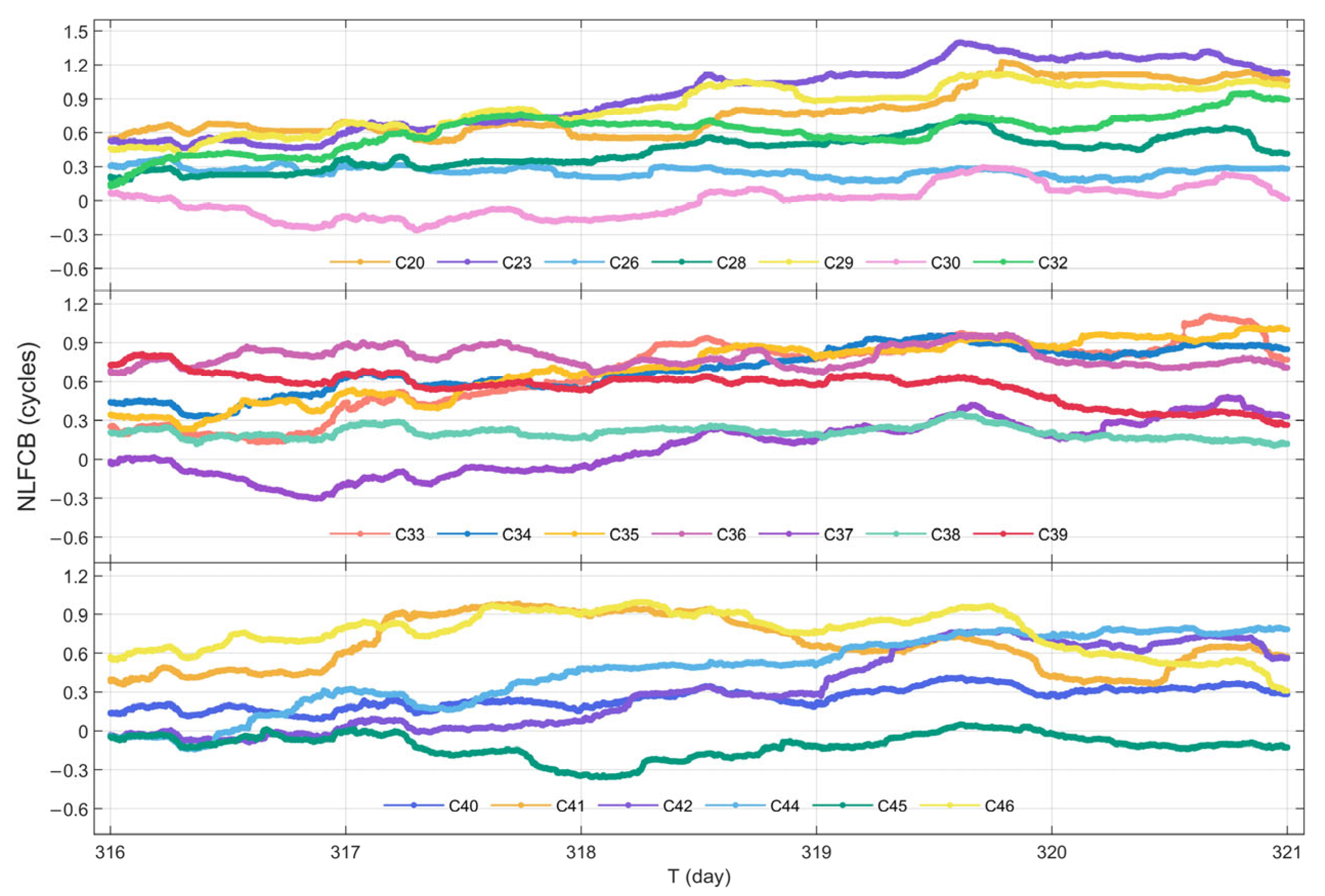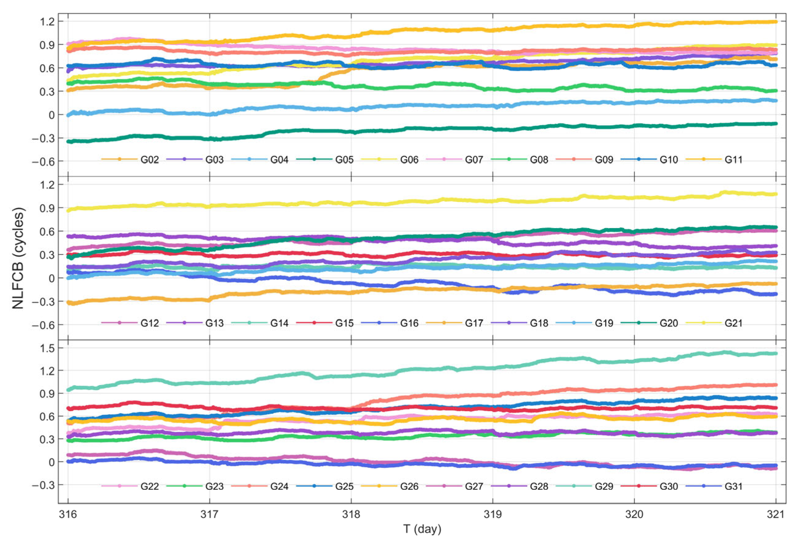 In this subsection, the raw NL FCB data from a 5-day period (DOY 316 to 320 in 2023) are selected for processing and analysis. Furthermore, since jumps are observed in the NL FCB across daily, the initial value of each subsequent day is aligned with the final value of the previous day during the construction of the NL FCB time series, thereby eliminating inter-day jumps.