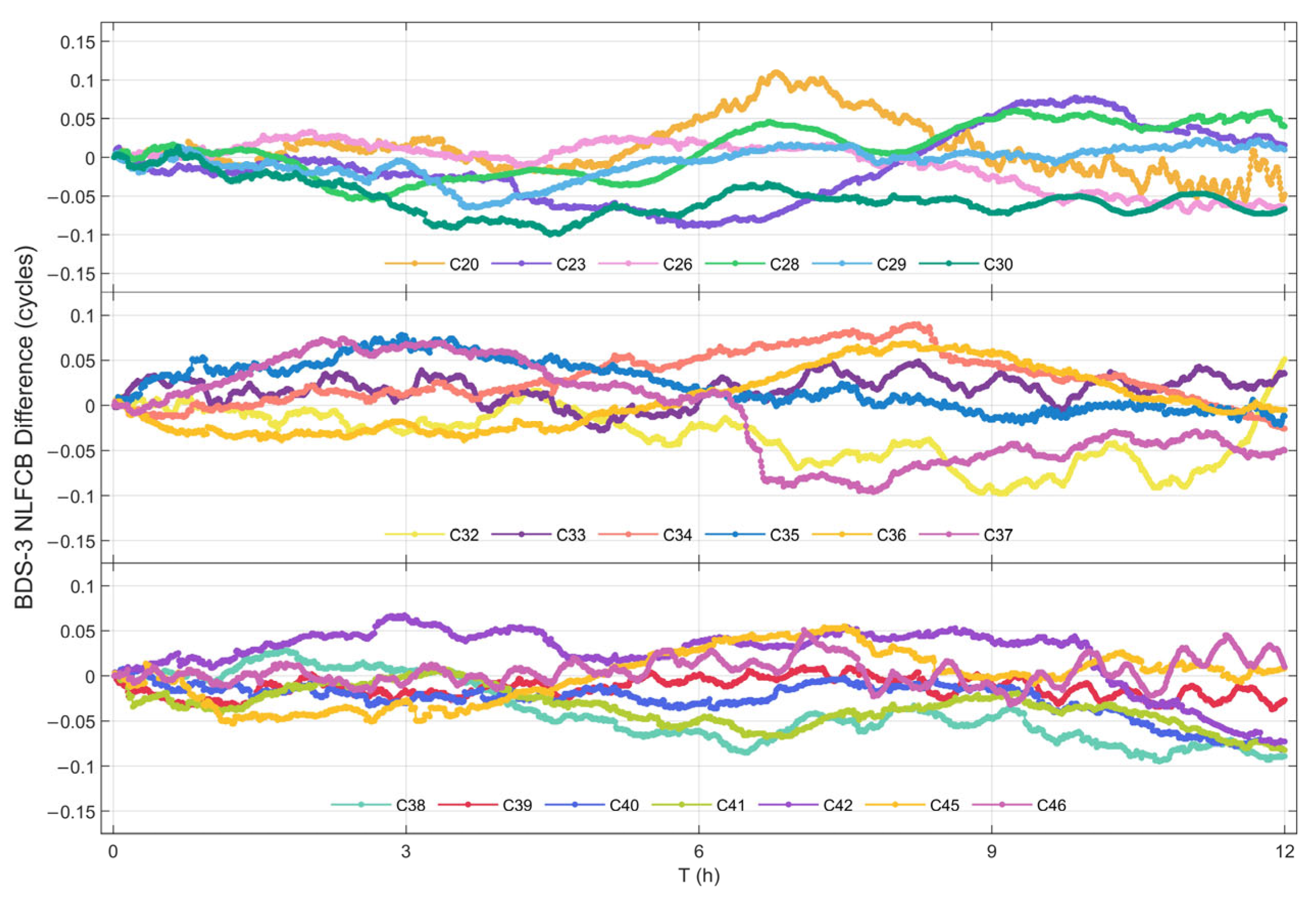It is noteworthy that certain satellites (e.g., C20, C39) exhibited a periodic fluctuation trend during the later stage of the prediction period (approximately 9 h). This behavior is attributed to the specific construction methodology of the NL FCB prediction model. Owing to the substantial volume of NL FCB data, the model is initially constructed based on actual values at the beginning of the prediction phase. However, as the prediction progresses, previously predicted values are utilized as inputs for forecasting subsequent values. This particular model characteristic leads to the propagation and accumulation of prediction errors and data trends, thereby resulting in the observed periodic phenomena.
