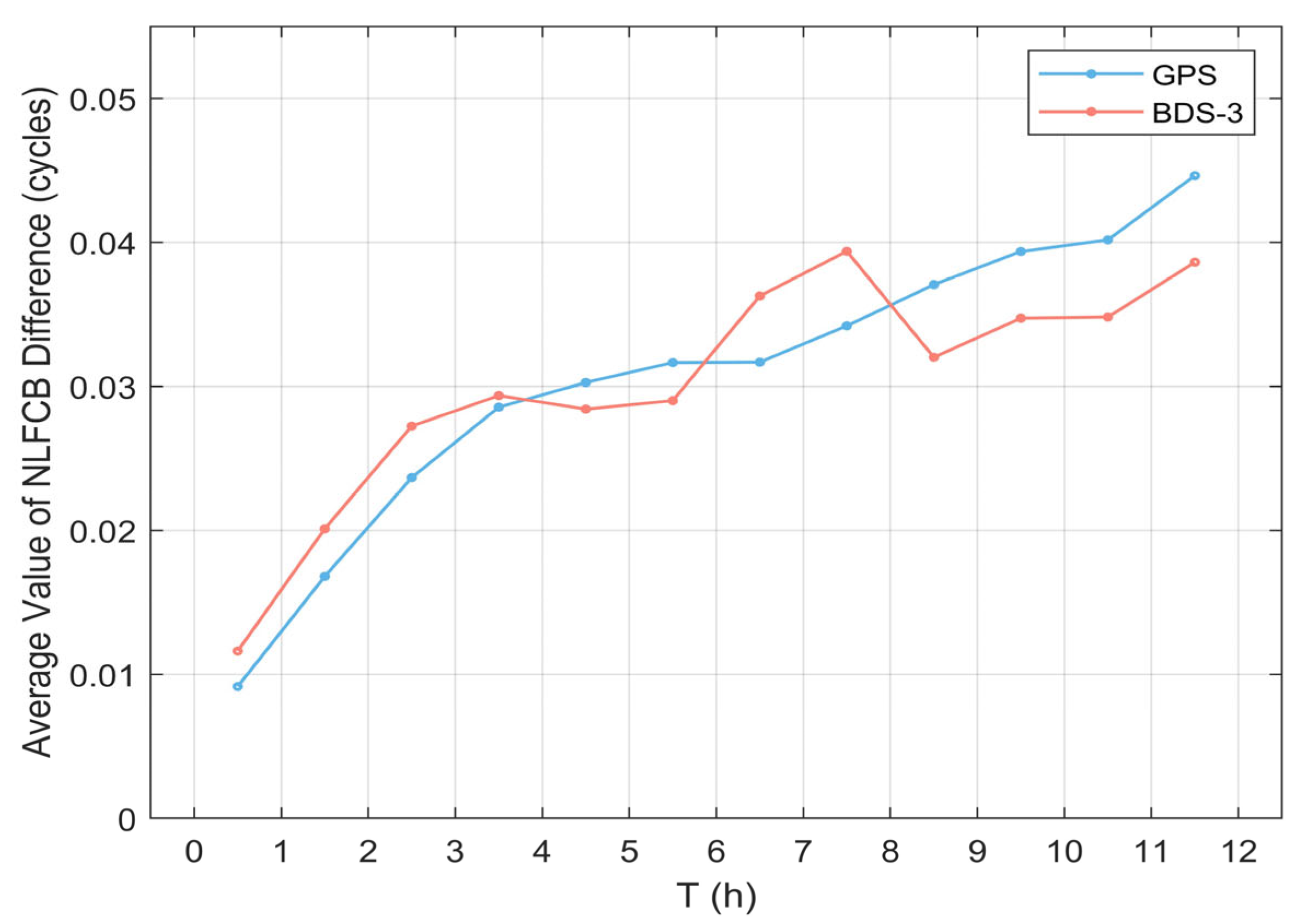 Figure 10 illustrates the average deviation value per hour for each satellite system, which can be used to reflect the average deviation of the prediction results on an hourly scale, thus facilitating the selection of appropriate observation periods based on the accuracy requirements of NL FCB. In general, as the prediction time increases, the single-difference sequence of the satellite NL FCB gradually diverges, and the average deviation increases overall. Specifically, the average deviation of GPS satellites during the 00:00–01:00 period is below 0.01 cycles, and the average deviation at the end of the observation does not exceed 0.05 cycles, with a steady increase over the 12 h period. For BDS-3 satellites, the average deviation during the 00:00–01:00 period is slightly higher than 0.01 cycles, but the average deviation at the end of the prediction does not exceed 0.04 cycles, with a reduction in the average deviation observed during the 08:00–09:00 period. This is because, unlike the divergence characteristic of the GPS single-difference sequence, some periodic fluctuations appear in the BDS-3 single-difference sequence, which affected the calculation of its average deviation, a result that is consistent with the findings shown in