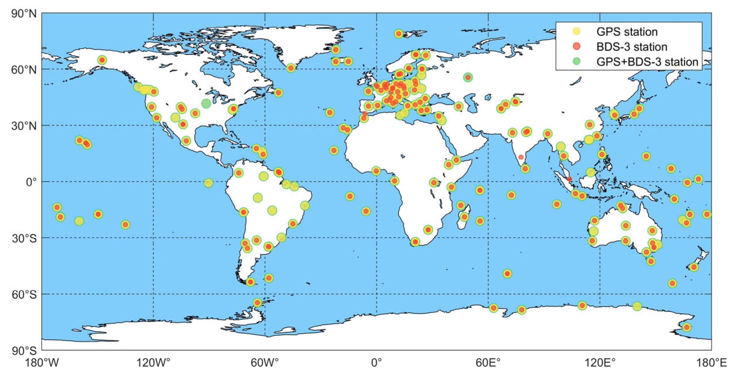 In this section, a substantial set of stations from the global MGEX network on DOY 321, 2023 are selected to perform positioning validation for different satellite systems. Specifically, 198 stations are used for the GPS, 176 for BDS-3, and 199 for the combined GPS + BDS-3. These stations are distributed across the region in