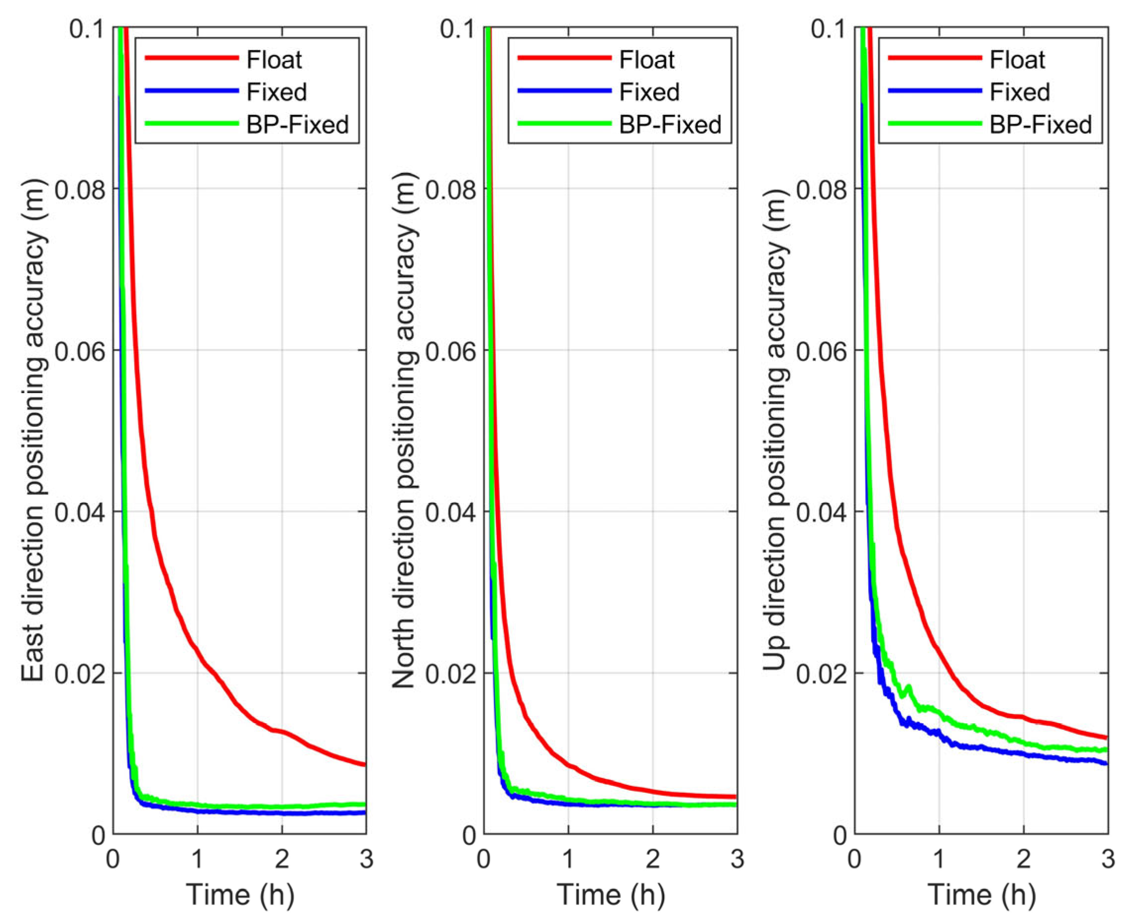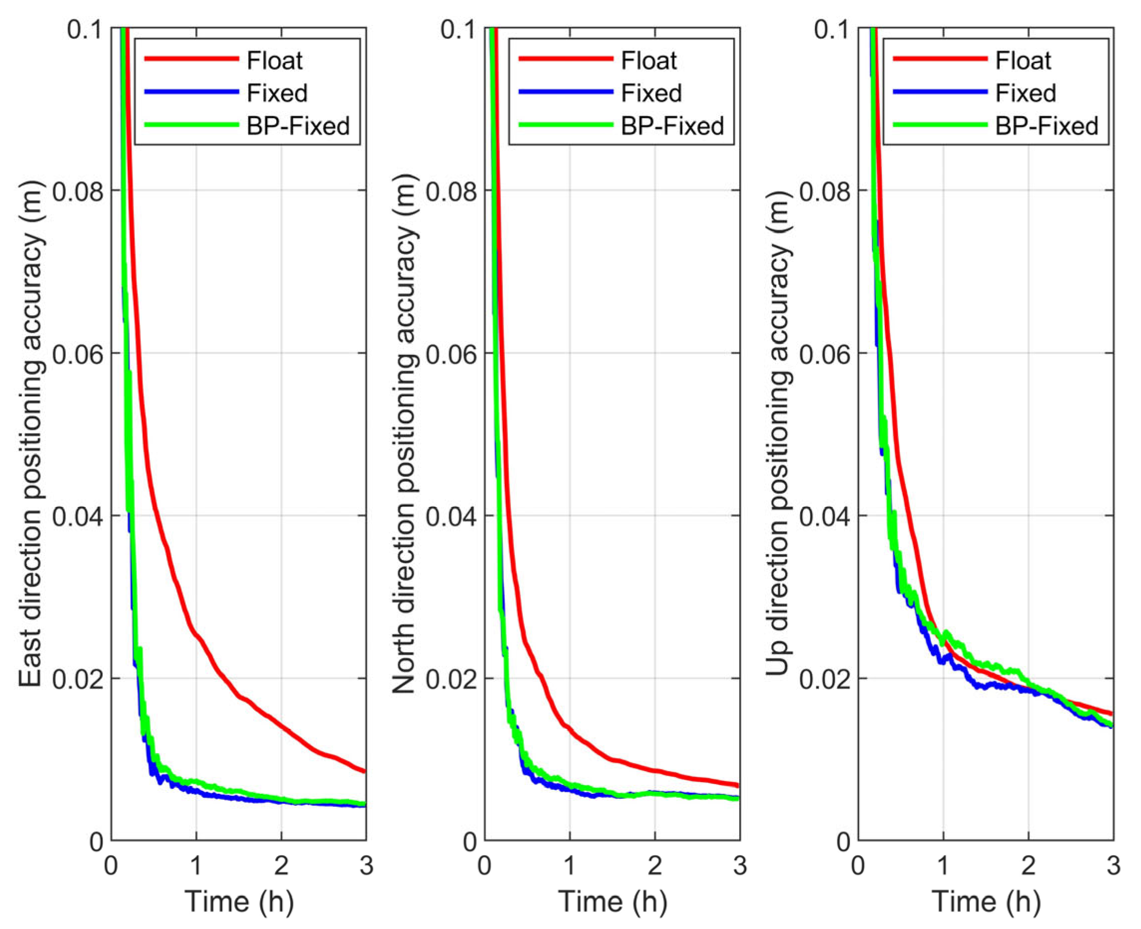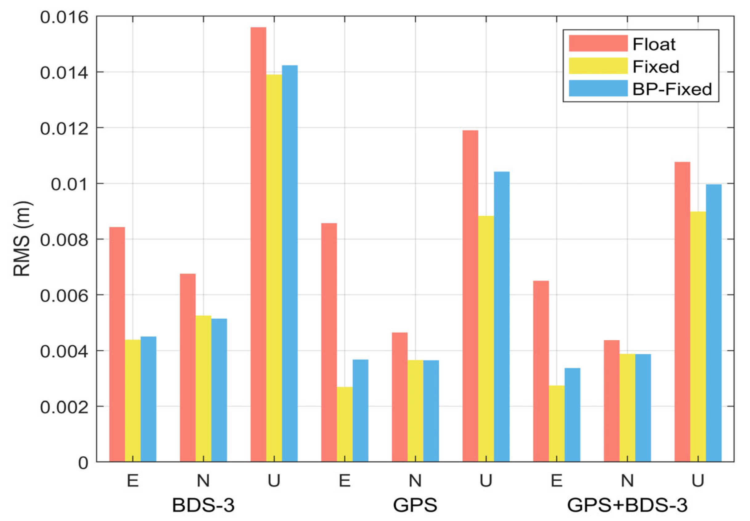 Furthermore, the value at the final epoch of the accuracy time series is defined as the RMS of the PPP scheme. The RMS of the Float, Fixed, and BP-Fixed for GPS, BDS-3, and GPS + BDS-3 are summarized in