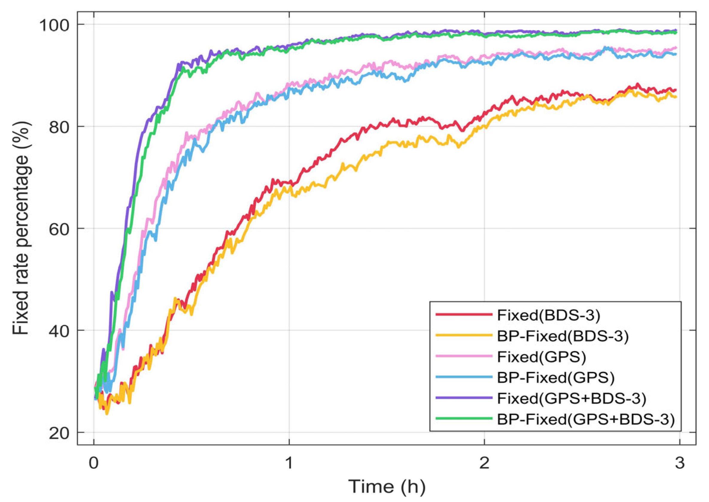 For a comparative analysis of the ambiguity fixed rates between Fixed and BP-Fixed, the rates during the last 30 min of the positioning session are selected for evaluation. The results are presented in