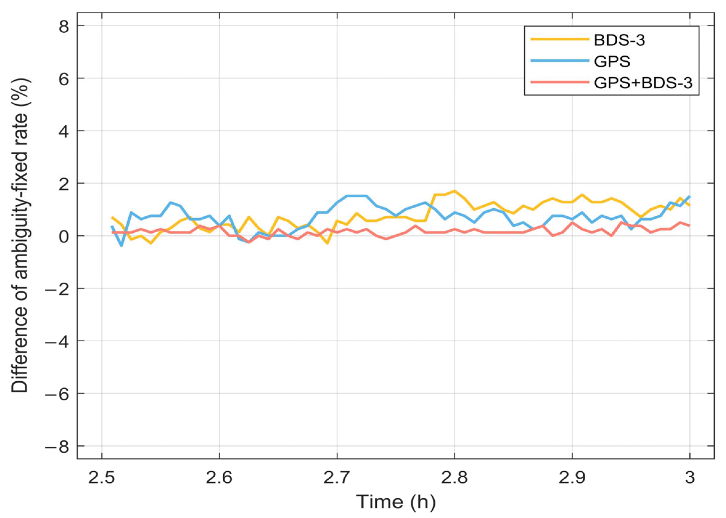 Figure 17. It can be observed that the difference in the fixed rates under the GPS + BDS-3 scheme is the smallest, not exceeding 0.5%. The differences for the BDS-3 and GPS are also low, both remaining within 2%. The average differences in fixation rates over the 3 h period for BDS-3, GPS, and GPS + BDS-3 are 2.39%, 1.37%, and 0.90%, respectively. Therefore, in terms of the ambiguity fixed rates, the predicted FCB is demonstrated to achieve a performance comparable to that of the iGMAS products.