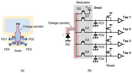 (a) The 4-tap pixel diagram and (b) the pixel circuit. The charge corridor is indicated by red dashed lines, which is shared by the gates.