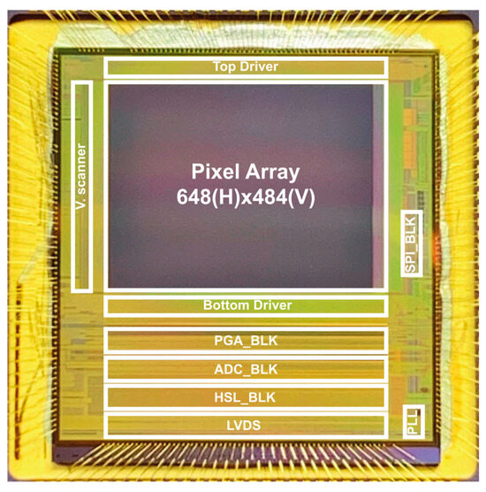 A micrograph of the prototype chip. V. scanner: vertical scanner. SPI_BLK: serial–parallel interface block. PGA_BLK: programmable gain amplifier block. ADC_BLK: analog-to-digital converter block. HSL_BLK: horizontal scanner logic. LVDS: low-voltage differential signaling. PLL: phase-locked loop.
