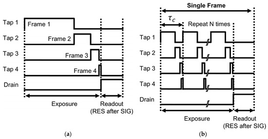 The conventional MEHDR method can be emulated using the 4-tap CIS. This is achieved by assigning four distinct exposure times to each of the four taps, enabling the sensor to capture multiple images with different photosensitivities in a single acquisition cycle. Figure 3a illustrates the process to capture four frames of image with four different photosensitivities. During the exposure period, a high gate voltage indicates that the corresponding gate is “ON,” allowing photoelectrons to accumulate in the designated tap. Conversely, a low gate voltage indicates the gate is “OFF”. As such, the effective exposure time for each tap is determined by the gate’s duty cycle. Furthermore, the duty cycle of the gates determines the DR of the synthesized HDR image, according to Equation (2). Each tap of the sensor is in a three-transistor pixel configuration that operates in differential delta sampling mode. During readout, each tap’s FD reset level (RES) is read after the signal level (SIG).