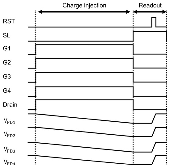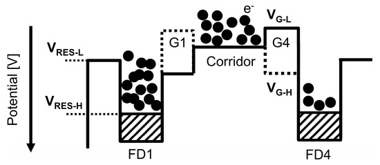 As a first step, we performed a charge injection experiment to measure the potential height of the charge corridor [14,15]. This potential is a critical parameter, as discussed in Section 3, that governs the trade-off between FWC and residual charge crosstalk. Figure 6 shows the pixel layout and the potential at the cross-section view along the A-B line and A- A’ line of the pixel. In this experiment, the drain gate was always ON. By decreasing the drain voltage (), charges were injected from the drain to the charge corridor. Simultaneously, the four transfer gates were switched ON during charge injection, allowing the charges to be transferred to all four taps. During readout, the charges in each of the four FDs were read. The injection time was set to 31.11 ms, being consistent with the HDR measurements. The drain voltage was swept from 1 V to 2.7 V in 0.05 V steps. Figure 7 shows the timing chart for the charge injection experiment. - represent the example voltage at each of the four FDs. Turning on G1-G4 starts the accumulation of the injected currents in the FDs. After the injection time, G1-G4 are turned off and - are read out. Finally, the floating diffusions are reset.