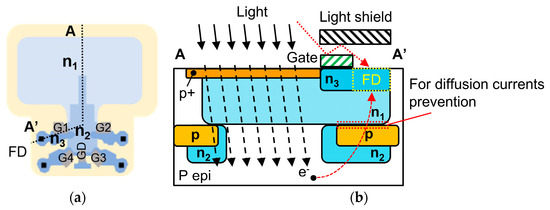 (a) The top view of the pixel and (b) the cross-section view along the A-A’ line, where optical crosstalk and diffusion current causes charges to accumulate in the inactive tap.