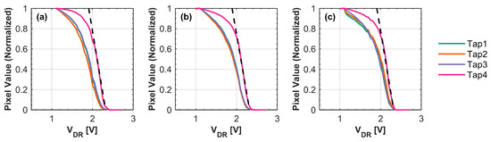 The charge injection experiment results with all gates ON. (a) VRES-L = 0.5 V, (b) VRES-L = 1.1 V, and (c) VRES-L = 1.7 V. The dashed line shows the linearly fitted pixel values at Tap 4 with ranging from 2.0 V to 2.2 V.