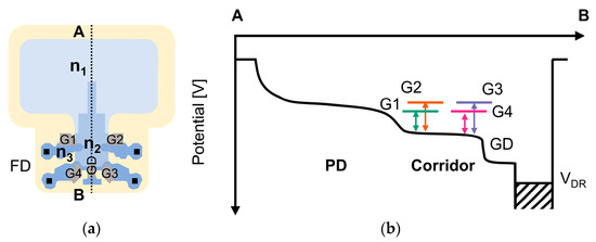 The measured results of the potential height of the charge corridor in Figure 8 and the draining performance in Figure 9 indicate that the four taps have different gate potential barrier heights, as illustrated in Figure 10. Taps 1 and 2 saturate before Taps 3 and 4, due to their proximity to the photodiode, as shown in Figure 9b. Furthermore, while in the pixel design, the four taps ideally should have the same gate potential barrier heights; horizontal mask misalignment can cause the difference in barrier height between G1 and G2 and between G3 and G4.