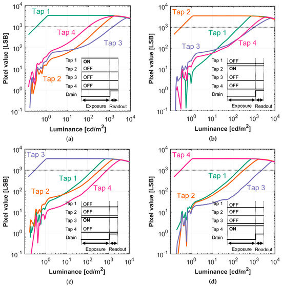 Luminance versus pixel value curve of the 4-tap image sensor while only one of taps is turned ON during accumulation. (a) Tap 1 active, (b) Tap 2 active, (c) Tap 3 active, (d) Tap 4 active.