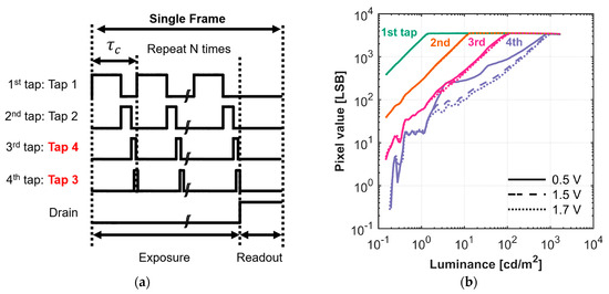(a) The tap setting of the HDR system and (b) luminance versus pixel value curve of the 4-tap image sensor with a reset gate low voltage range from 0.5 V to 1.7 V.