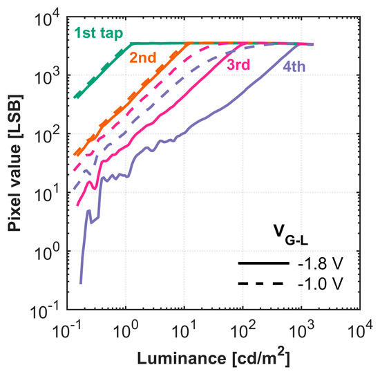 Luminance versus pixel value curve of the 4-tap image sensor with different transfer gate low voltage.