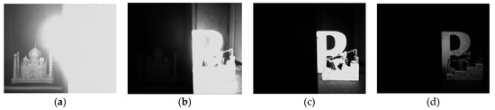A sample of captured images of an HDR scene from the four taps: (a) first tap, (b) second tap, (c) third tap, (d) fourth tap, using the 4-tap image sensor and the shortest time window at the fourth tap.