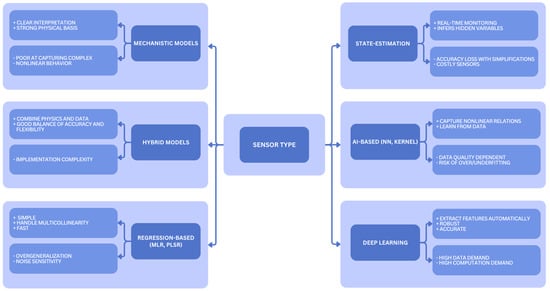 Soft sensors can be classified according to the modeling strategies used to transform raw measurements and auxiliary variables into reliable process information. These strategies encompass mechanistic, regression-based, state-estimation, AI–based, and deep learning-based frameworks, as illustrated schematically in Figure 1.
