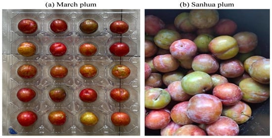 The experimental materials for this study consisted of March plums (Figure 1a) and Sanhua plums (Figure 1b), with a total of 780 samples. Some samples were harvested from orchards, while others were purchased from fruit markets. Prior to data collection, the experimental materials were stored at room temperature for approximately 24 h. Subsequently, spectral data collection was performed. Before spectral data acquisition, samples were numbered. After collecting image and spectral data, SSC data was finally collected.