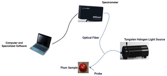 The main experimental setup is shown in Figure 2, including a near-infrared spectrometer QE PRO+NQ512-1.7 (wavelength range 350–1700 nm), a tungsten halogen light source (HL-2000-HP-FHSA), a reflection probe (QR400-7-VIS-NIR), and optical fiber for light transmission, which are all from Ocean Optics Corporation, Dunedin, FL, USA. Prior to spectral acquisition, sample surfaces were carefully cleaned with tissue paper and allowed to equilibrate to room temperature. For near-infrared spectral acquisition, the halogen light source was preheated for 30 min to ensure stability. To reduce background noise, a standard reflectance white board was used as a reference. Samples were placed on the probe connected to the near-infrared spectrometer, and spectral acquisition was performed using OceanView 2.0.12 spectral acquisition software developed by Ocean Optics. Priority was given to selecting the equatorial region of fruits with intact peel, no mechanical damage, and no physiological disease spots as spectral measurement sites. During acquisition, with the fruit stem as the axis, three circular samples were taken at 120° intervals, and data fusion was performed to generate standard spectra, eliminating local feature differences for subsequent spectral analysis. The spectrometer was set to automatic reference mode with an integration time of 100 ms, spectral averaging of 8 times, spectral smoothing width of 1, and spectral data were saved sequentially according to the acquisition order [].