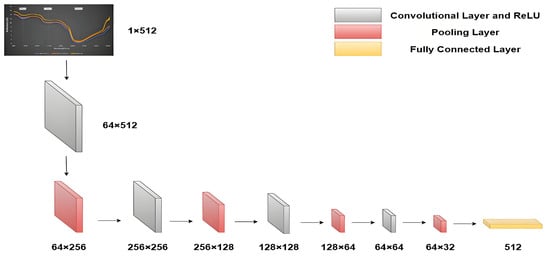 The primary advantage of CNN lies in its algorithmic strategy capable of directly extracting features from raw input data. Compared to traditional neural networks, CNNs possess stronger learning and classification capabilities. This study utilized a modified 1D-CNN to extract spectral features. The 1D-CNN model consists of three convolutional layers, each followed by a batch normalization layer, a ReLU activation function, and a max pooling layer. The classification results are ultimately output through two linear layers. The denoised spectral data was input into the 1D-CNN model, where convolutional layers performed feature extraction, generating 512 spectral feature vectors. The NIRS data feature extraction process is illustrated in Figure 6. Unlike the original model, the fully connected classification layers were reduced, directly retaining the 512 feature vectors.