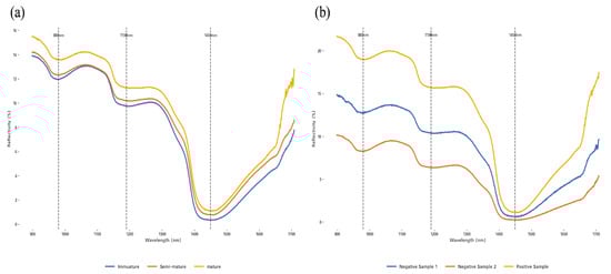 The internal nutritional components of plums vary with quality. Particularly during plum ripening, significant changes occur in internal nutritional components, including decreased chlorophyll content and increased anthocyanin content. Figure 9 displays sample images of plums at three different maturity levels: unripe, semi-ripe, and ripe. These changes occurring during ripening are reflected in the spectral absorption curves shown in Figure 10a. The curves demonstrate consistent trends across different maturity stages, with ripe plums exhibiting higher spectral intensity in the 900–1350 nm range. Distinct reflectance valleys were detected at wavelengths of 980 nm, 1190 nm, and 1450 nm, consistent with water molecule characteristic absorption bands. During plum ripening, intrinsic biochemical components and hydration states cause changes in light transmission spectral curves. These changes indicate that the optical properties of plums have significant correlation with their intrinsic developmental trajectory. Spectral analysis can distinguish differences in maturity between internal and external regions of the fruit.