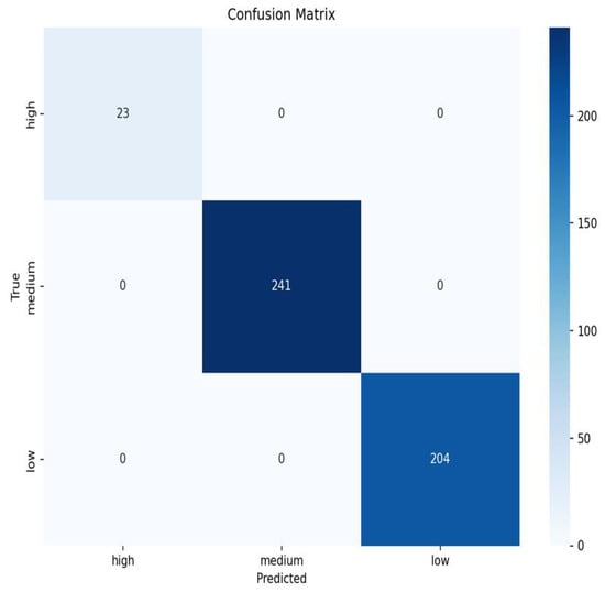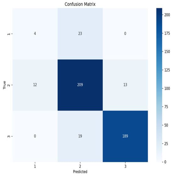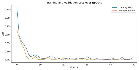 To examine the multimodal fusion classification network from multiple perspectives and more intuitively display classification results, we plotted the confusion matrix for multimodal fusion classification model results, as shown in Figure 15. Overall, the classification accuracy is very high. Additionally, we analyzed loss values during model training to comprehensively evaluate overall model performance, as shown in Figure 16. The loss function curves on both training and test sets showed a rapid decline trend, subsequently stabilizing. After approximately 50 training iterations, loss values for both training and test sets stabilized at 0.56. The loss curves indicate model convergence, suggesting good training performance and the model’s ability to correctly capture patterns in the training data.