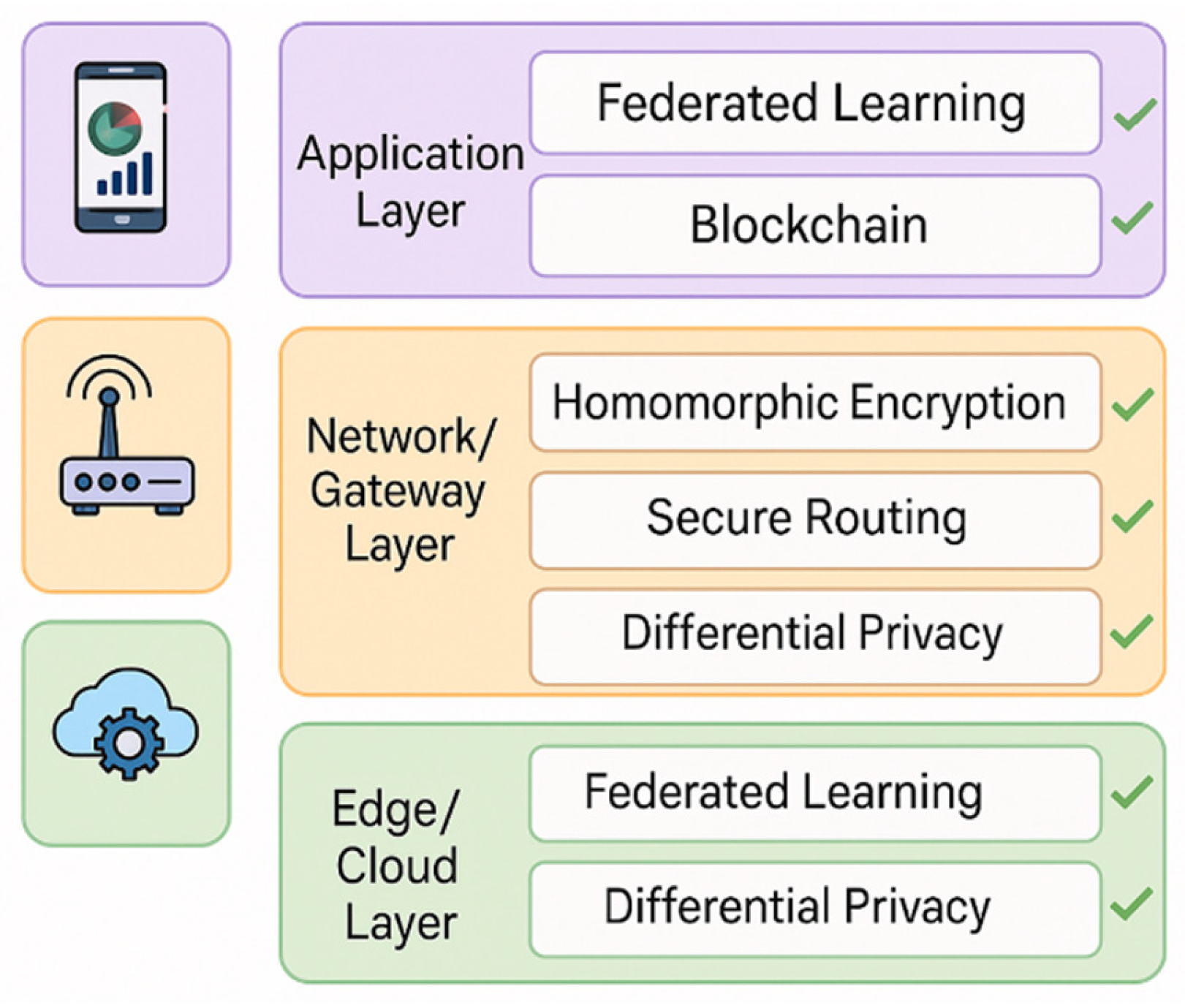 - Encryption/Blockchain-Based: Data confidentiality, decentralized trust, integrity protection.