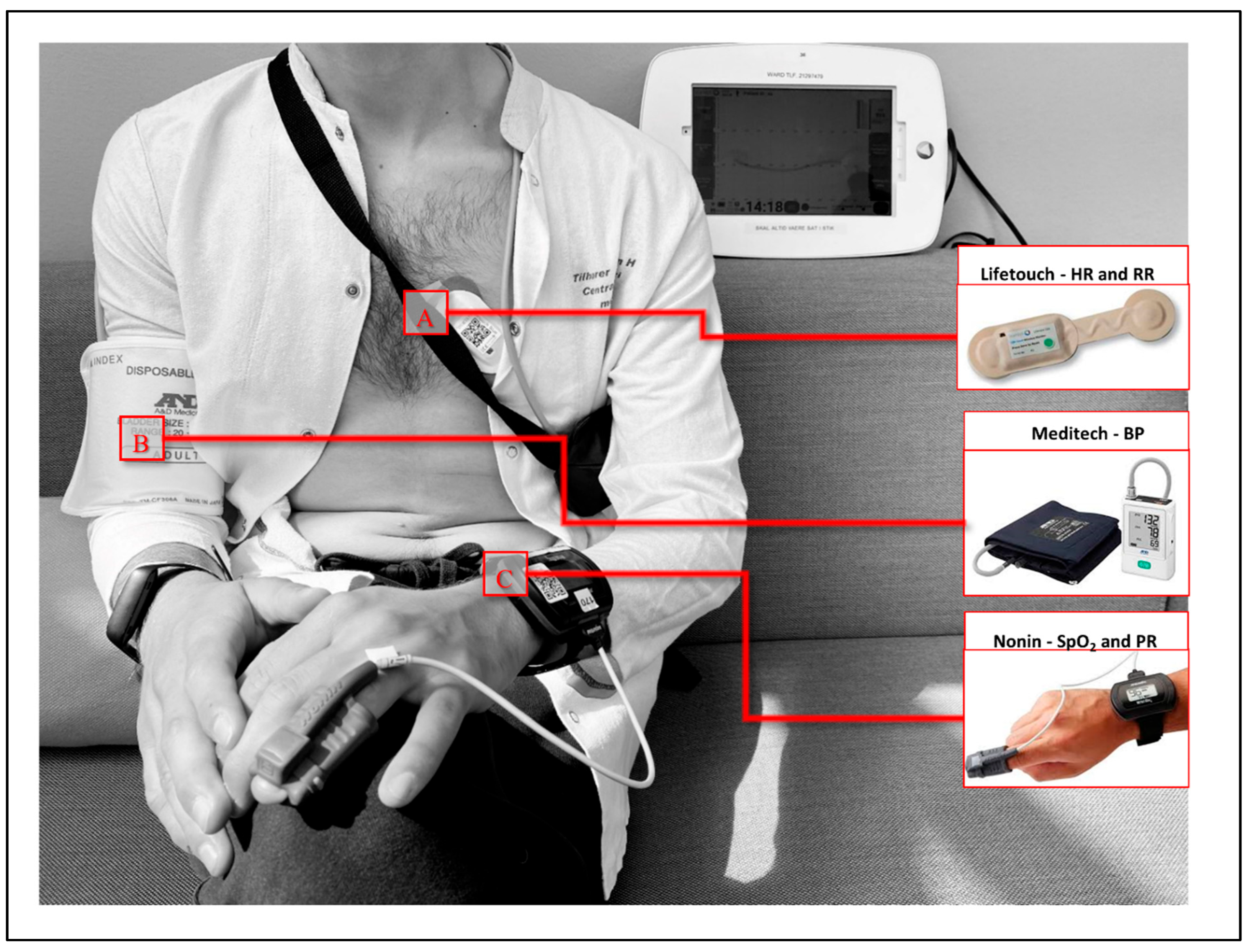 - Haahr-Raunkjaer, C.; Skovbye, M.; Rasmussen, S.M.; Elvekjaer, M.; Sørensen, H.B.D.; Meyhoff, C.S.; Aasvang, E.K. Agreement between Standard and Continuous Wireless Vital Sign Measurements after Major Abdominal Surgery: A Clinical Comparison Study. Physiol. Meas. 2022, 43, 115007. [Google Scholar] [CrossRef]