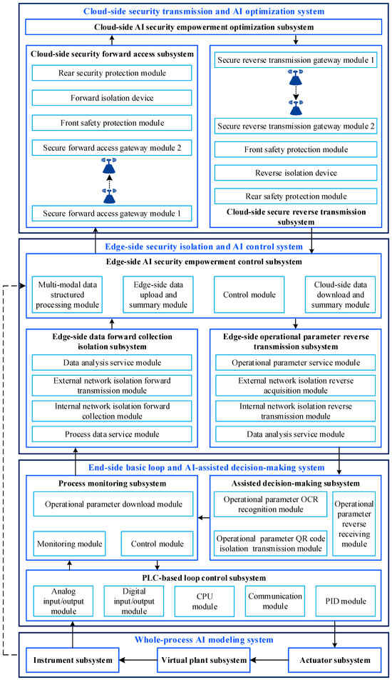 As shown in Figure 4b, standard C#, JavaScript, and MATLAB (R2023b) are utilized for integrated programming of backend AI algorithms and frontend human–computer interaction interfaces. This resulted in the development of a software system encompassing virtual actuator, virtual plant, virtual instrumentation, process monitoring, auxiliary decision-making, edge-side AI security empowerment control, and cloud-side AI security empowerment optimization subsystems. Moreover, PLC-based loop control subsystem, edge-side forward data collection isolation, edge-side operational parameter reverse transmission, cloud-side security forward access, and cloud-side security reverse transmission subsystems are implemented using commercial hardware to ensure secure data transmission and isolation.