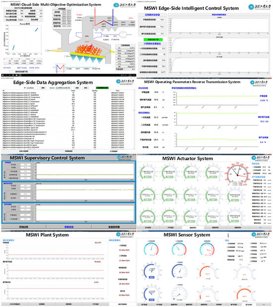 As shown in Figure 6, the developed AISE3CMP-MSWI enables smooth signal communication between various systems according to the functional design requirements. Additionally, leveraging the proposed multi-objective intelligent optimal control method, the platform verifies the accuracy of data transmission between systems and provides an effective engineering verification environment for the research of AI empowerment of the MSWI process. This platform not only offers technical support for further improving the intelligent operation of the MSWI process but also establishes a foundation for future intelligent optimization research in other CIPs.